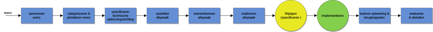 De uitvoer van het proces "afspreken" is één of meerdere wijzigingsverzoeken om de wens te realiseren. Als bijlage wordt het dossier van de wens gekoppeld.