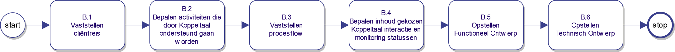 | B.3 | Vaststellen procesflow | Op basis van de vastgestelde cliëntreis wordt bepaald welke Koppeltaal Zorg(ondersteunende) business use cases hiervoor kunnen worden ingezet. | |