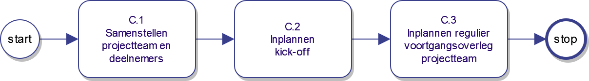 | C.2 | Inplannen kick-off | De projectleider (zorgaanbieder) plant een de kick-off in. Tijdens de kick-off worden afspraken gemaakt rondom planning, deadlines en acties. | n.v.t. |