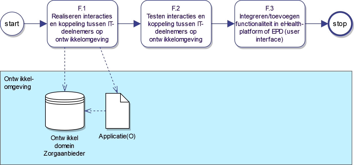 | F3 | Integreren/toevoegen functionaliteit in eHealth-platform of EPD (user interface) | Als IT-deelnemer zorgt u in deze stap voor het ontwikkelen en aanpassen van de gebruikersinterface van de applicatie (EPD of eHealth-platform). | n.v.t. |