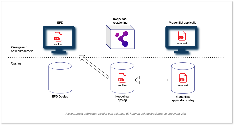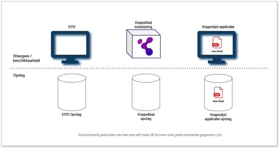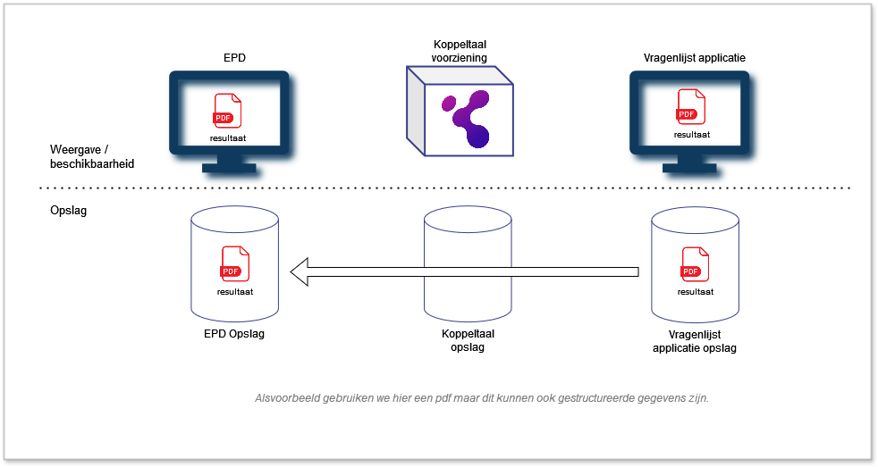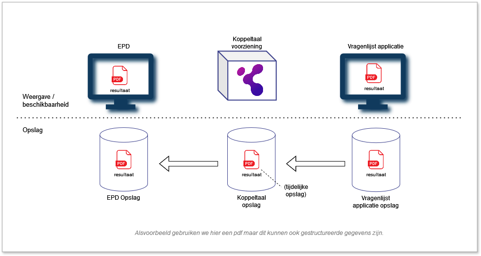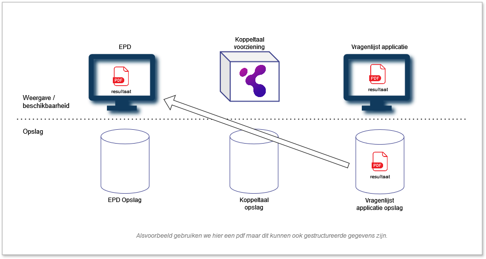 Nadat de pdf is gemaakt door de vragenlijst applicatie kan deze beschikbaar worden gesteld door deze op te slaan in de Koppeltaal opslag. Applicaties die een abonnement hebben op dit type gebeurtenis kunnen via de referentie de pfd direct ophalen vanuit de vragenlijst applicatie en tonen in het EPD, zonder deze te kopiëren naar de opslag van het EPD. Koppeltaal wordt binnen dit scenario niet enkel meer als uitwisselsysteem gezien maar als opslagsysteem.