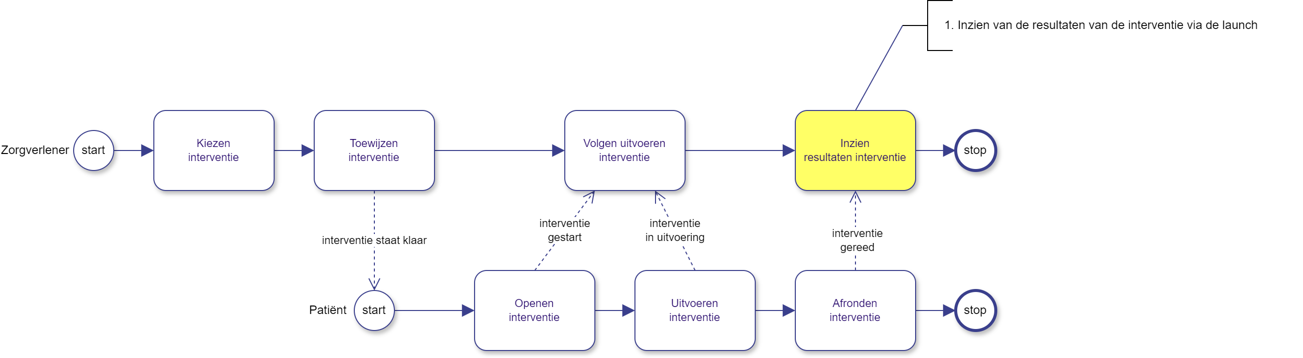| Start patiënt | De patiënt is ingelogd in de applicatie waar de toegewezen interventie zichtbaar is. | In dit voorbeeld is dat het patiëntenportaal. Vaak is zo’n portaal onderdeel van het ECD of van het e-health platform. |