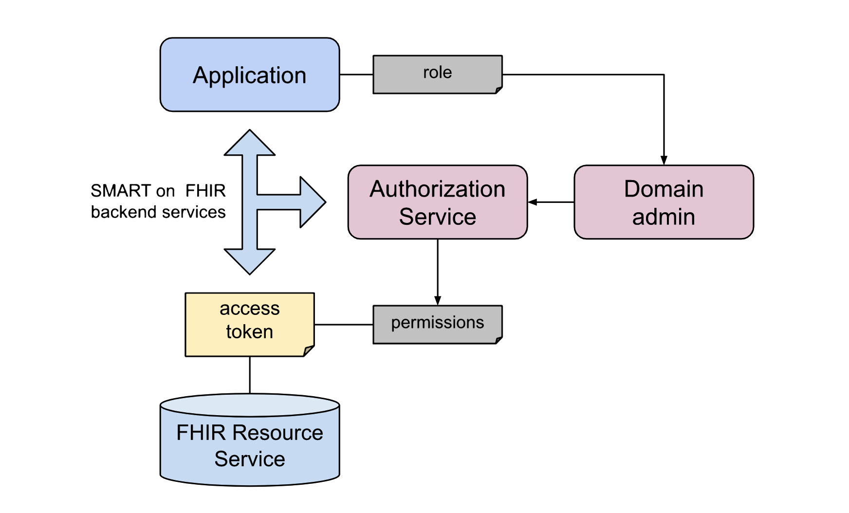 In koppeltaal hebben applicaties toegang tot een FHIR resource service in een domein. Deze toegang wordt gegeven door de autorisatie service. De applicaties worden geconfigureerd in de domein database. Deze database bevat rollen met daaraan gekoppeld permissies. Op basis van de rol(en) van de applicatie kent de autorisatie service permissies toe aan de applicatie. Dit doet deze door het genereren van een access token voor de applicatie. Deze access token wordt aan de applicatie toegekend door middel van SMART on FHIR backend services.