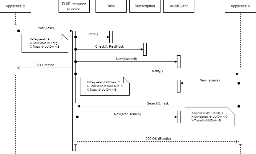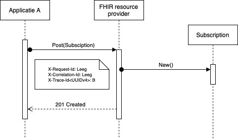 - De applicatie B doet een update op een resource die binnen de search criteria en search narrowing van de Subscription van applicatie A valt, de applicatie A mag de X-Request-ID vullen. Indien niet, vult de FHIR resource service deze in met een nieuwe UUIDv4. Applicatie A mag een X-Trace-ID meesturen, indien afwezig mag de FHIR resource service deze zelf vullen met een UUIDv4.