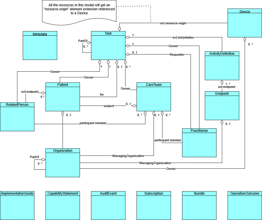De owner van de Task in het diagram hieronder moet één van vier entiteiten zijn: de Patient, de Practitioner, de RelatedPersonof een CareTeam. In het geval dat een CareTeam een Task owner is, dan moet de CareTeam de Patient als subject hebben. Let op, in het diagram lijkt het dat er vier mogelijke owners zijn van een Task, echter in de realiteit heeft elke Task maar één owner.